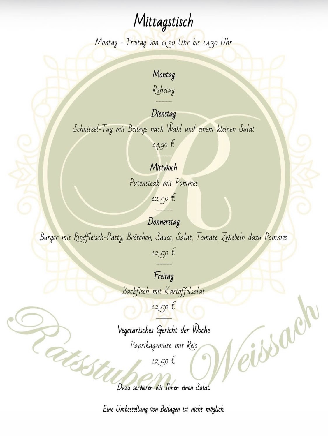 Unseren wöchentlich wechselnden Mittagstisch gibt es immer Dienstag - Freitag (Montag Ruhetag)